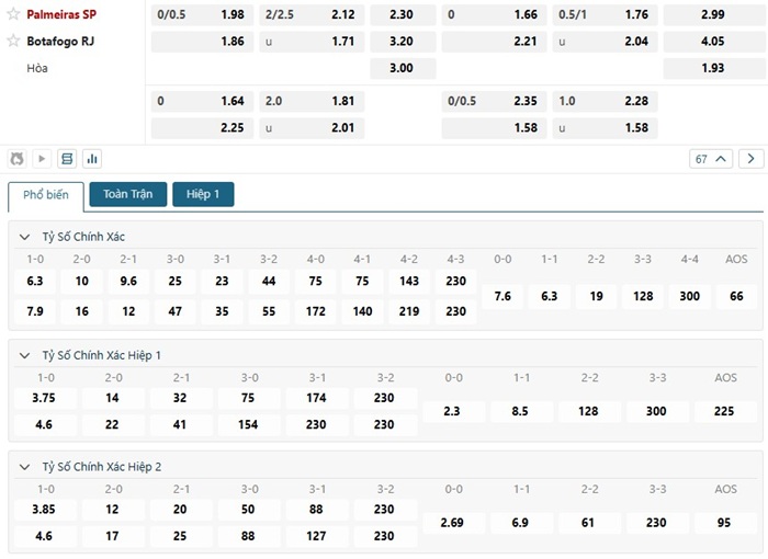 Kèo tỷ số giữa Palmeiras vs Botafogo