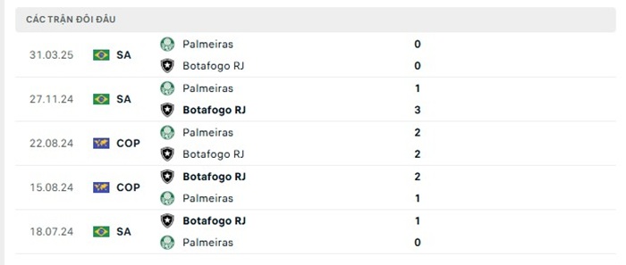 Lịch sử đối đầu của Palmeiras vs Botafogo