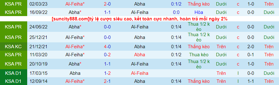 Trên sân khách, Al Feiha cũng không dễ bị đánh bại khi bất bại trong 4 trận đấu gần nhất (thắng kèo 3/4 trận). Trong những năm qua, Al Feiha không ngại Abha khi bất bại trong 5 trận đấu đối đầu gần đây.