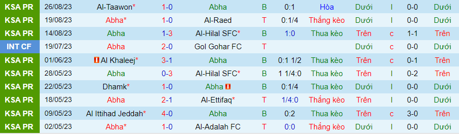 Trong khi đó, chiến thắng duy nhất của Abha là khi họ xếp cửa trên trước Al Raed. Yếu tố đột biến của Abha có thể xuất hiện trên sân nhà. Tại đây, CLB này đã giành chiến thắng trong 5/7 trận gần đây. Hai thất bại của Abha đều trước Al Hilal.