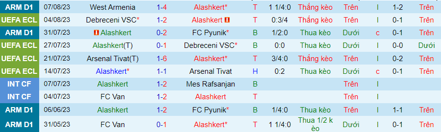 Alashkert đã thắng 1, thua 1 ở giải VĐQG Armenia mùa giải này. Đó là kết quả đúng như dự đoán. Họ không thể cưỡng lại thất bại trước đối thủ rất mạnh là Pyunik. Bên cạnh đó, Alashkert đã bị loại khỏi Europa Conference League sau thất bại trước Debrecen ở loạt sút luân lưu.