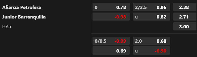 Soi kèo châu Á: Ở trận đấu này, nhà cái để tỷ lệ 0:0 nhưng điểm ăn ở cửa chủ nhà Alianza Petrolera đã giảm sâu từ 1.00 xuống 0.78. Có thể thấy, niềm tin hướng về cửa Alianza Petrolera, bất chấp việc họ lép vế về đối đầu trước Junior Barranquilla. Alianza Petrolera rất mạnh trên sân nhà. Điều này có thể giúp họ tạo nên sự khác biệt trong cuộc tiếp đón Junior Barranquilla đang gặp vấn đề ở sân khách.