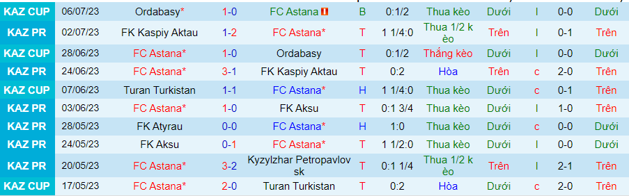 Thống kê 10 trận gần nhất của Astana