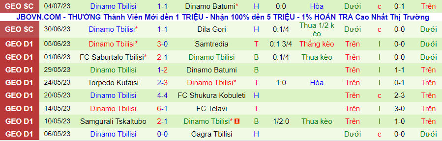 Thống kê 10 trận gần nhất của Dinamo Tbilisi