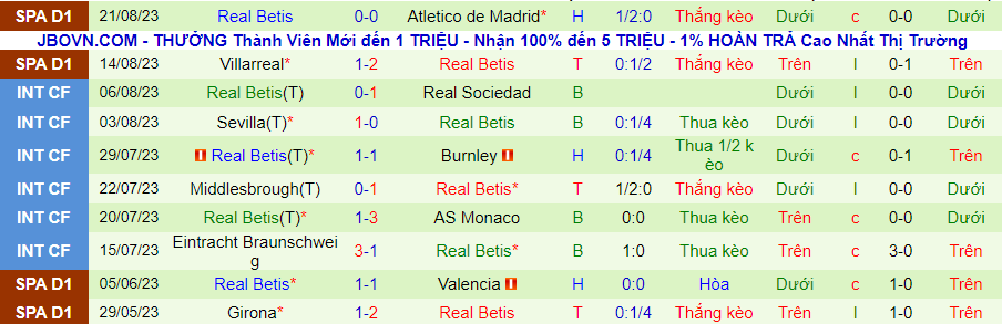 Betis đã hoàn thành nhiệm vụ khi giành 4 điểm trong 2 trận đấu vs Villarreal và Atletico Madrid. Việc thắng kèo trong cả 2 trận đấu đó (đều xếp cửa dưới) là tín hiệu đáng khen vs CLB xứ Andalucia.