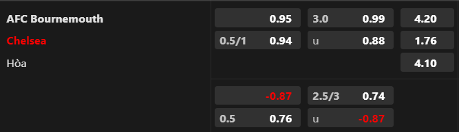 Soi kèo tài xỉu: Niềm tin chuyển dịch vào khả năng trận đấu bùng nổ khi cột mốc tài xỉu tăng từ 2 3/4 lên 3. Thống kê cho thấy 4/6 cuộc đối đầu gần đây của hai đội đều nổ Tài. Kịch bản này diễn ra trong 3/4 trận gần đây của Bournemouth và 3/4 trận gần nhất của Chelsea.