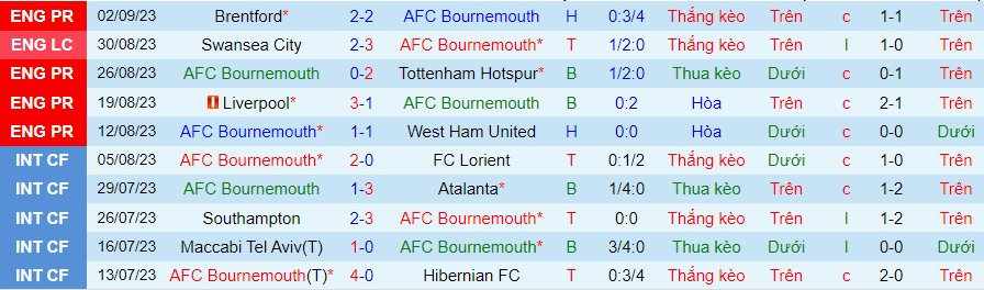Bournemouth khởi đầu khá tệ trong mùa giải này. Họ vẫn chưa biết tới mùi chiến thắng sau 4 trận đấu. Điều đó đẩy CLB xuống vị trí thứ 16 trên bảng xếp hạng vs 2 điểm. Tuy nhiên, điều đáng nói là Bournemouth lại có tỷ lệ thắng kèo khá tốt.