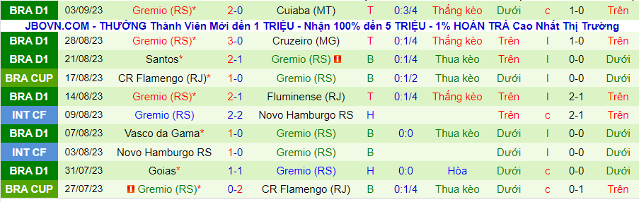 Thống kê 10 trận gần nhất của Gremio