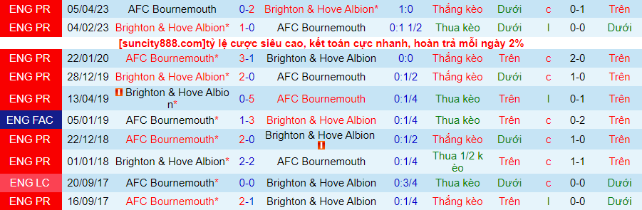 Lịch sử đối đầu giữa Brighton vs Bournemouth