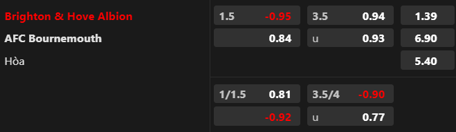 Soi kèo châu Á: Dù Brighton thua ở cúp châu Âu nhưng họ vẫn nhận được niềm tin ở trận đấu này. Điểm ăn ở cửa Brighton chấp -1 1/2 đã giảm từ -0.90 xuống -0.95. Rõ ràng, ở giải Ngoại hạng Anh, Brighton mang nhân cách khác. Họ thắng 4/5 trận đấu từ đầu mùa. Trong những năm qua, Brighton cũng chiếm ưu thế khi hạ gục Bournemouth 4/6 trận gần nhất.
