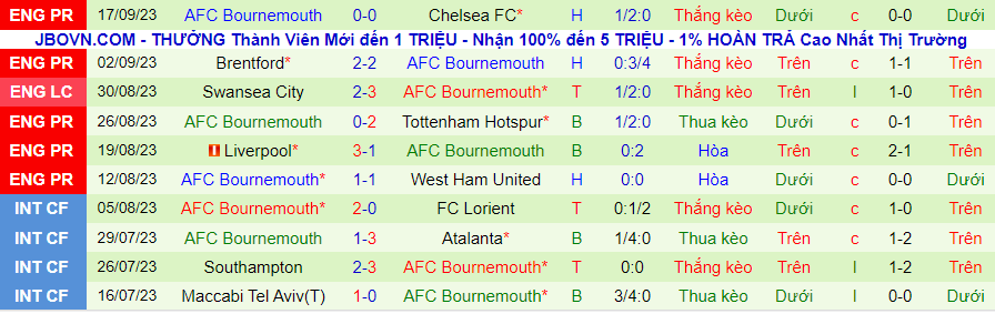 Thống kê 10 trận gần đây của Bournemouth