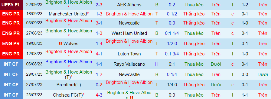 Thống kê 10 trận gần đây của Brighton
