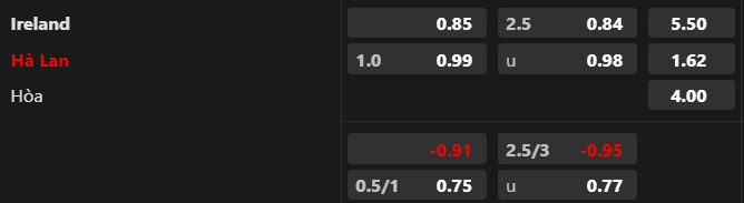 Tỷ lệ kèo CH Ireland vs Hà Lan
