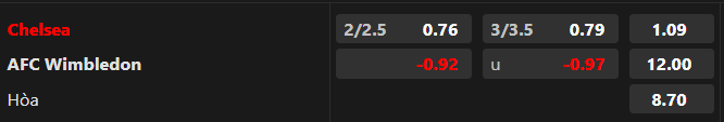 Soi kèo tài xỉu: Điểm ăn ở cửa Tài 3 1/4 đã giảm sâu từ 0.92 xuống 0.79. Niềm tin hướng về khả năng trận đấu có nhiều bàn thắng trong bối cảnh cửa trên lợi kèo. Hai trận đấu gần nhất của Chelsea nổ Tài. Trận đấu vs AFC Wimbledon là cơ hội tốt để hàng công của họ bắn phá. Trận đối đầu duy nhất của hai đội có tới 5 bàn thắng.