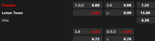 Soi kèo châu Á: Niềm tin đang hướng về cửa Chelsea. Nhà cái để chủ nhà chấp -1 3/4 nhưng điểm ăn ở cửa này đã giảm từ 0.98 xuống 0.88. Thực tế, The Blues khá tệ trong thời gian qua nhưng vấn đề ở chỗ, Luton Town quá yếu. Trong cả 2 cuộc đối đầu trong quá khứ, Chelsea đều thắng dễ dàng trước đối thủ này.