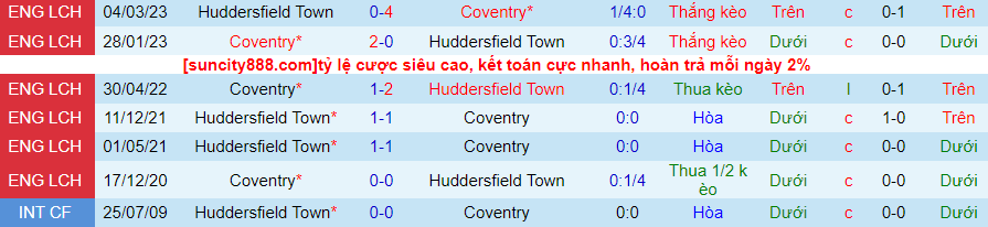 Lịch sử đối đầu giữa Coventry vs Huddersfield
