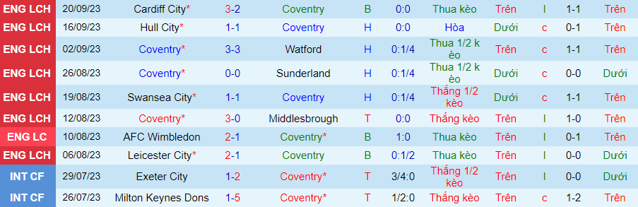 Đương nhiên, tỷ lệ thắng kèo của Coventry cũng ở mức tệ. Đội bóng này thua kèo 4 trận gần đây (thua kèo 6/8 trận gần nhất). Ngay cả trên sân nhà, Coventry chưa chắc tìm được sức bật khi hòa 3/4 trận gần đây (thua kèo 3/4 trận).