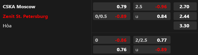 Soi kèo tài xỉu: Điểm ăn ở cửa Xỉu 2 1/2 đã giảm sâu từ -0.98 xuống 0.85. Có thể thấy niềm tin hướng về khả năng trận đấu có ít bàn thắng. 4/6 cuộc đối đầu gần đây của hai đội chứng kiến kịch bản Xỉu. Bên cạnh đó, 2 trận gần đây của CSKA Moscow và 8/11 trận gần đây của Zenit có ít bàn.