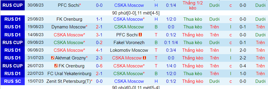 Thống kê 10 trận gần nhất của CSKA Moscow