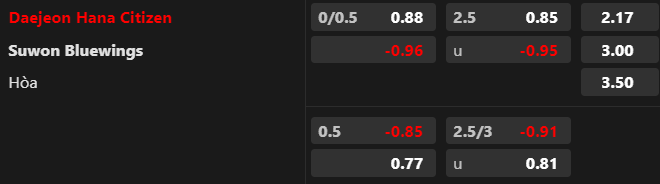 Soi kèo châu Á: Điểm ăn ở cửa Daejeon chấp -1/4 giảm từ 0.96 xuống 0.88. Điều đó cho thấy niềm tin lớn vào chủ nhà. Dù lép vế trước Suwon Bluewings trong quá khứ nhưng thời điểm này, Daejeon có thể hy vọng vào kết quả khác. Nguyên nhân bởi Suwon Bluewings thi đấu quá tệ. Daejeon lại thắng 2/3 trận gần nhất ở sân nhà.