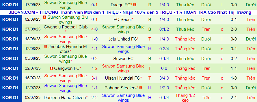 Lịch sử đối đầu giữa Daejeon vs Suwon Bluewings
