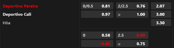 Soi kèo tài xỉu: Điểm ăn ở cửa Tài 2 1/4 đã giảm sâu từ 0.98 xuống 0.75. Có thể thấy niềm tin đang dồn khá nhiều vào khả năng trận đấu bùng nổ. Thống kê cho thấy 4/6 trận đấu gần đây của Deportivo Pereira trên sân nhà và 5/8 trận gần nhất của Deportivo Cali đều chứng kiến nhiều bàn thắng.