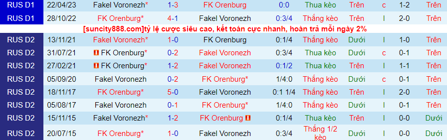 Lịch sử đối đầu giữa Fakel vs Orenburg