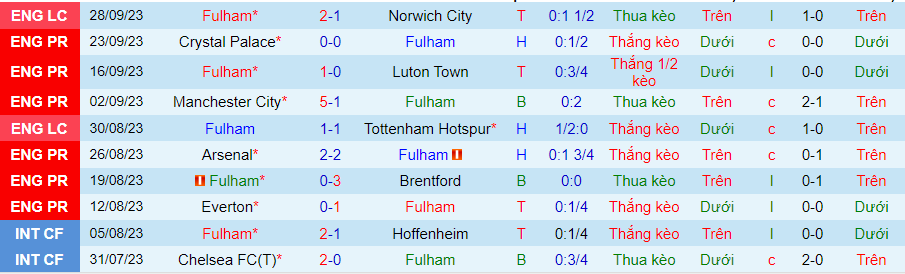 Trong đó, cả hai chiến thắng của Fulham đều diễn ra trên sân nhà. Thực tế, đội bóng này là kênh đầu tư tốt ở mùa giải này khi thắng kèo 6/9 trận đấu. Họ hoàn toàn có thể tận dụng lợi thế sân nhà để tiếp tục tạo nên cú bật.