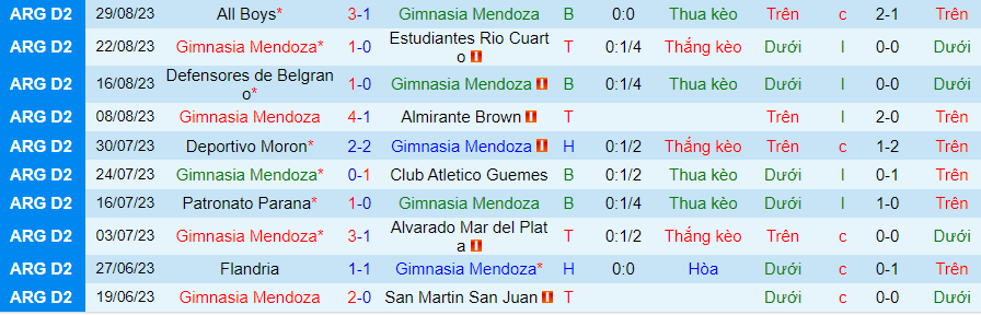 Thống kê 10 trận gần nhất của Gimnasia Mendoza