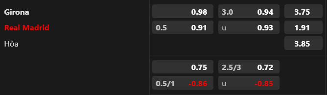 Soi kèo châu Á: Ở trận đấu này, nhà cái để Real Madrid chấp -1/2. Trong nhiều năm qua, chưa bao giờ họ chấp đối thủ thấp như vậy. Rõ ràng, có sự nghi ngờ nhất định vào cửa Real Madrid. Việc duy trì chuỗi 3 trận bất bại liên tiếp khi gặp Los Blancos cho thấy Girona không hề tầm thường. Bên cạnh đó, Girona còn đạt tỷ lệ thắng kèo 100% trong mùa giải này.