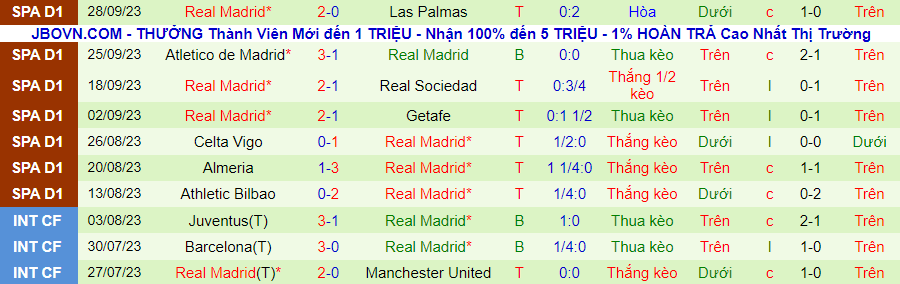 Thống kê 10 trận gần nhất của Real Madrid