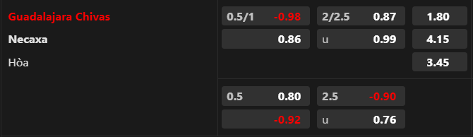 Soi kèo châu Á: Khá bất ngờ khi niềm tin đang chuyển dịch vào cửa Necaxa. Nhà cái để Guadalajara Chivas chấp -3/4 nhưng điểm ăn ở cửa Necaxa lại hạ từ -0.94 xuống 0.88. Đó là mức giảm khá sâu khiến nhiều người suy nghĩ. Trong những năm qua, Guadalajara Chivas chiếm ưu thế tuyệt đối trước Necaxa nhưng vs sự chuyển dịch kèo, khả năng trận đấu có thể chứng kiến bất ngờ. Necaxa không dễ bị đánh bại khi hòa cả 2 trận ở mùa giải này.