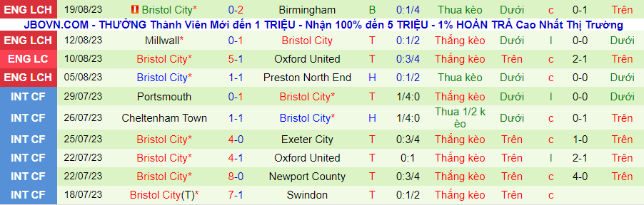 Bristol lại có phong độ ngược lại. Họ đã giành 4 điểm sau hai trận đấu gặp Preston và Millwall nhưng ở vòng đấu gần nhất, đội bóng này đã hứng chịu thất bại trước Birmingham. Hiện tại, Bristol đang xếp thứ 14 vs 4 điểm.
