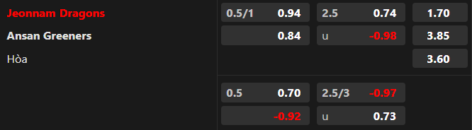 Soi kèo châu Á: Khá bất ngờ khi niềm tin ở trận đấu này lại hướng về cửa Ansan Greeners. Điểm ăn ở cửa đội khách được chấp +3/4 đã giảm sâu từ 0.90 xuống 0.84. Jeonnam Dragons chưa chắc tận dụng được sự yếu kém của đối thủ khi hòa 3/5 trận đấu gần nhất ở sân nhà. Bên cạnh đó, Jeonnam Dragons còn thua 4/6 cuộc đối đầu gần đây vs Ansan Greeners. Cái dớp đối đầu có thể níu chân Jeonnam Dragons.