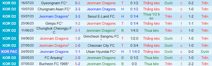 Hiện tại, Jeonnam Dragons đang xếp thứ 7 trên bảng xếp hạng giải hạng 2 Hàn Quốc và kém nhóm dự play-off thăng hạng 6 điểm. Trên sân nhà, Jeonnam Dragons bất bại trong 8 trận gần đây nhất và họ thắng kèo 5/6 trận gần nhất.