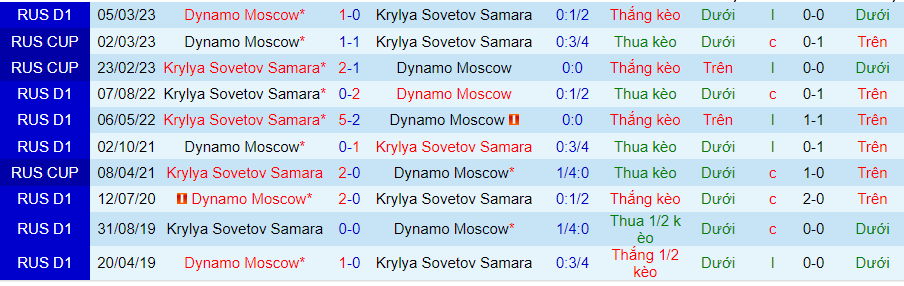 Lịch sử đối đầu giữa Krylya Sovetov vs Dynamo Moscow