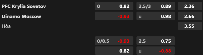 Tỷ lệ kèo Krylya Sovetov vs Dynamo Moscow