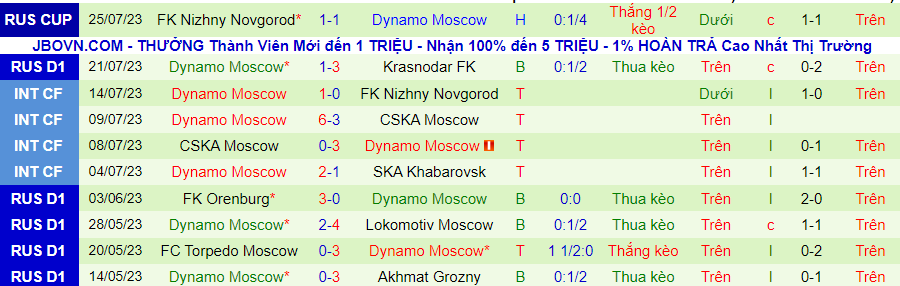 Thống kê 10 trận gần nhất của Dynamo Moscow