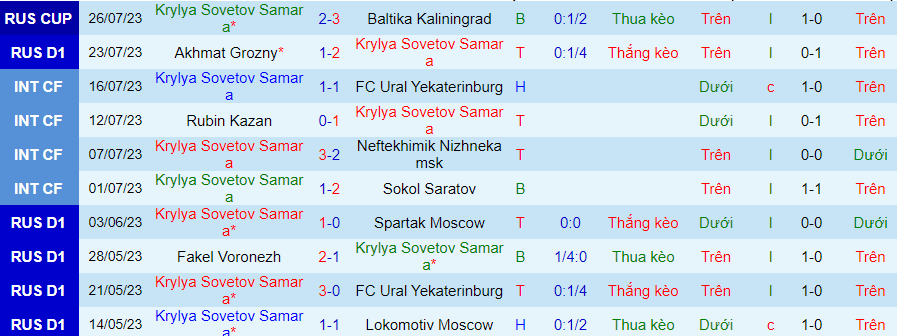 Thống kê 10 trận gần nhất của Krylya Sovetov
