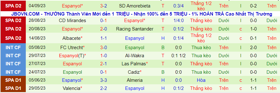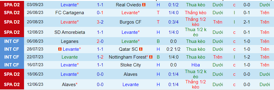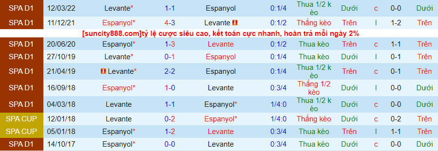 vs việc thắng kèo trong 4 trận đấu, Espanyol cho thấy họ là thách thức lớn vs Levante trong trận đấu này. Trên sân khách, đội bóng xứ Catalan cũng thắng kèo trong 4 trận đấu chính thức gần đây.
