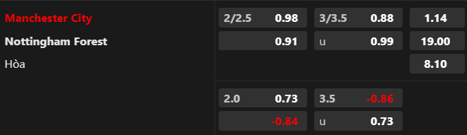 Soi kèo châu Á: Nhà cái để Man City chấp -2 1/4 vs sự chuyển dịch kèo không quá lớn. Dù Man City có tỷ lệ thắng kèo tốt nhưng nên nhớ, họ đang trải qua lịch thi đấu rất dày. Trong trận đấu gần nhất, Man City đã thua kèo chấp sâu trước Red Star. Trong bối cảnh ấy, Nottingham có thể là lựa chọn đáng tin. Họ tạo ra nhiều khó khăn cho ông lớn ở Ngoại hạng Anh mùa này.