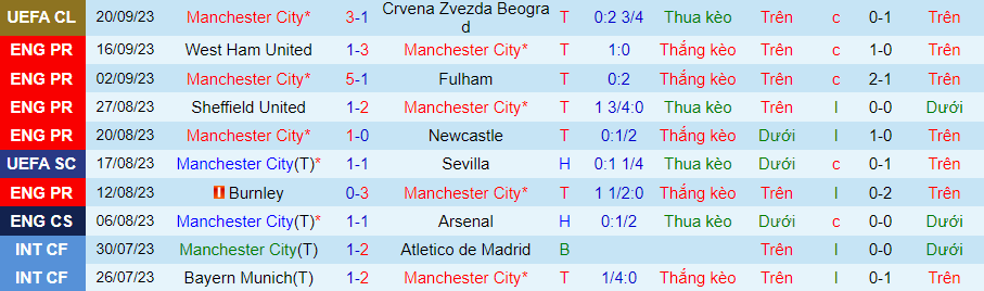 Thống kê 10 trận gần nhất của Man City