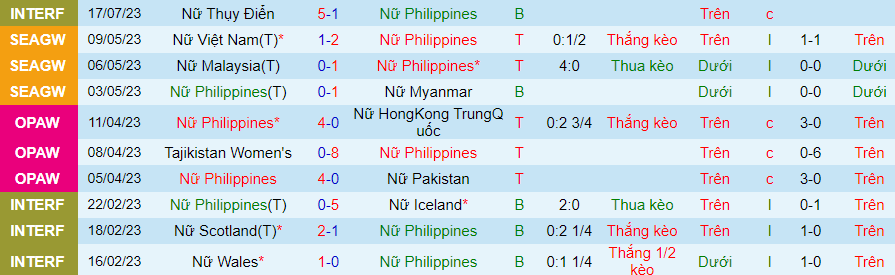 Thống kê 10 trận gần đây của nữ Philippines