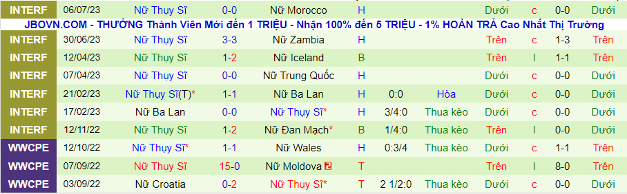 Thống kê 10 trận gần đây của nữ Thụy Sĩ