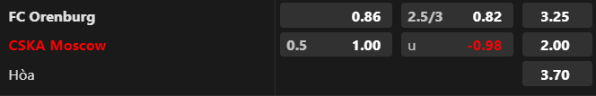 Tỷ lệ kèo Orenburg vs CSKA Moscow