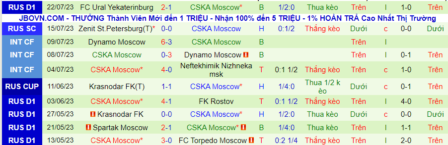 Thống kê 10 trận gần đây của CSKA Moscow