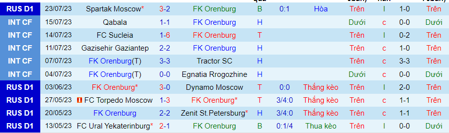 Thống kê 10 trận gần đây của Orenburg