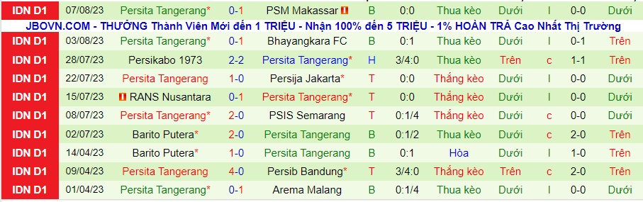 Trên sân khách, Persita cũng thi đấu không thực sự ấn tượng. Đội bóng này chỉ giành chiến thắng trong 1/5 trận đấu làm khách gần nhất. Trong đó, Persita cũng chỉ thắng kèo trong 1/5 trận đấu này.