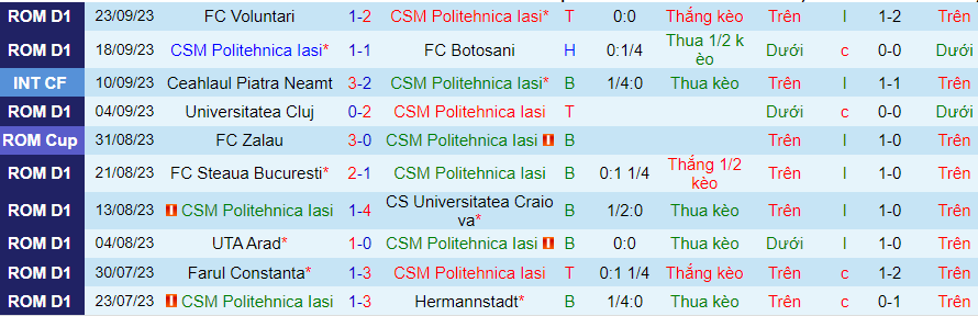 Thống kê 10 trận gần đây của Politehnica Iasi