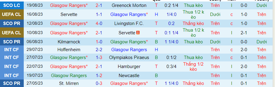 Thống kê 10 trận gần nhất của Rangers